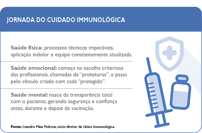 O último pilar é o da saúde mental, que valoriza o contato desde o agendamento até o pós-imunização, proporcionando uma relação de segurança e confiança, baseada na transparência das informações. “As protetoras são treinadas para ouvir, observar, sentir e adaptar a experiência a cada pessoa”, reforça o sócio-diretor da Immunológica.