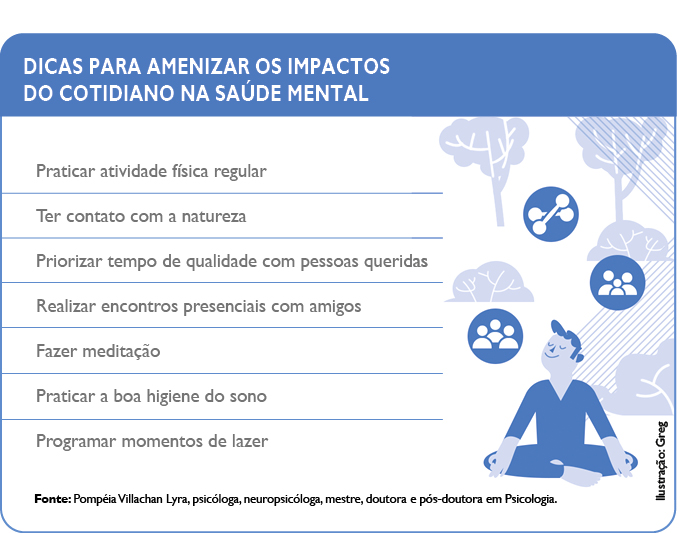 Já o psiquiatra Vitor Hugo aponta que mitigar os efeitos da rotina na saúde mental exige responsabilidades do poder público, empresas e de cada indivíduo.