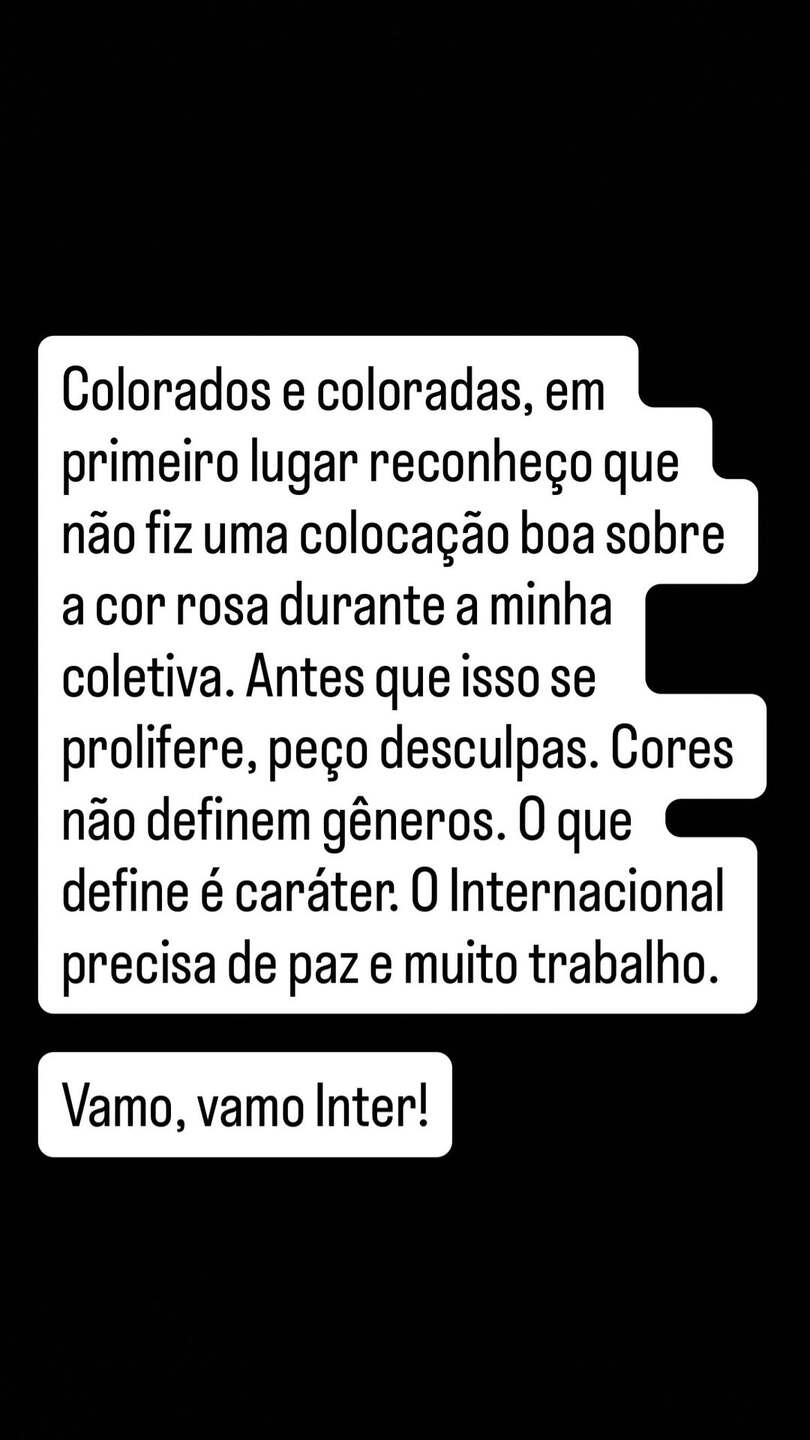Abel Braga pediu desculpas em seu perfil no Instagram após reproduzir falas homofóbicas durante a sua apresentação como técnico do Internacional. Foto: Reprodução/@abelbragaoficialAos 73 anos, Abel aceitou assumir o time sem remuneração e com contrato válido apenas para as duas últimas rodadas. A missão é árdua: o Colorado entrou no Z-4 no sábado, tem 41 pontos e precisa vencer São Paulo e Red Bull Bragantino para permanecer na elite.