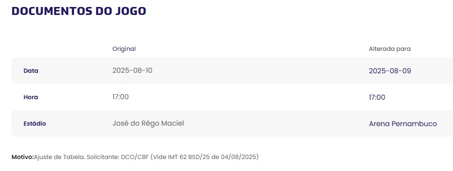 A Confederação Brasileira de Futebol (CBF) publicou, no fim da manhã desta segunda-feira (4), as modificações de local e data da partida entre Santa Cruz e Sergipe, pela 2ª fase da Série D do Campeonato Brasileiro. O duelo será disputado no próximo sábado (9), às 17h, na Arena de Pernambuco.