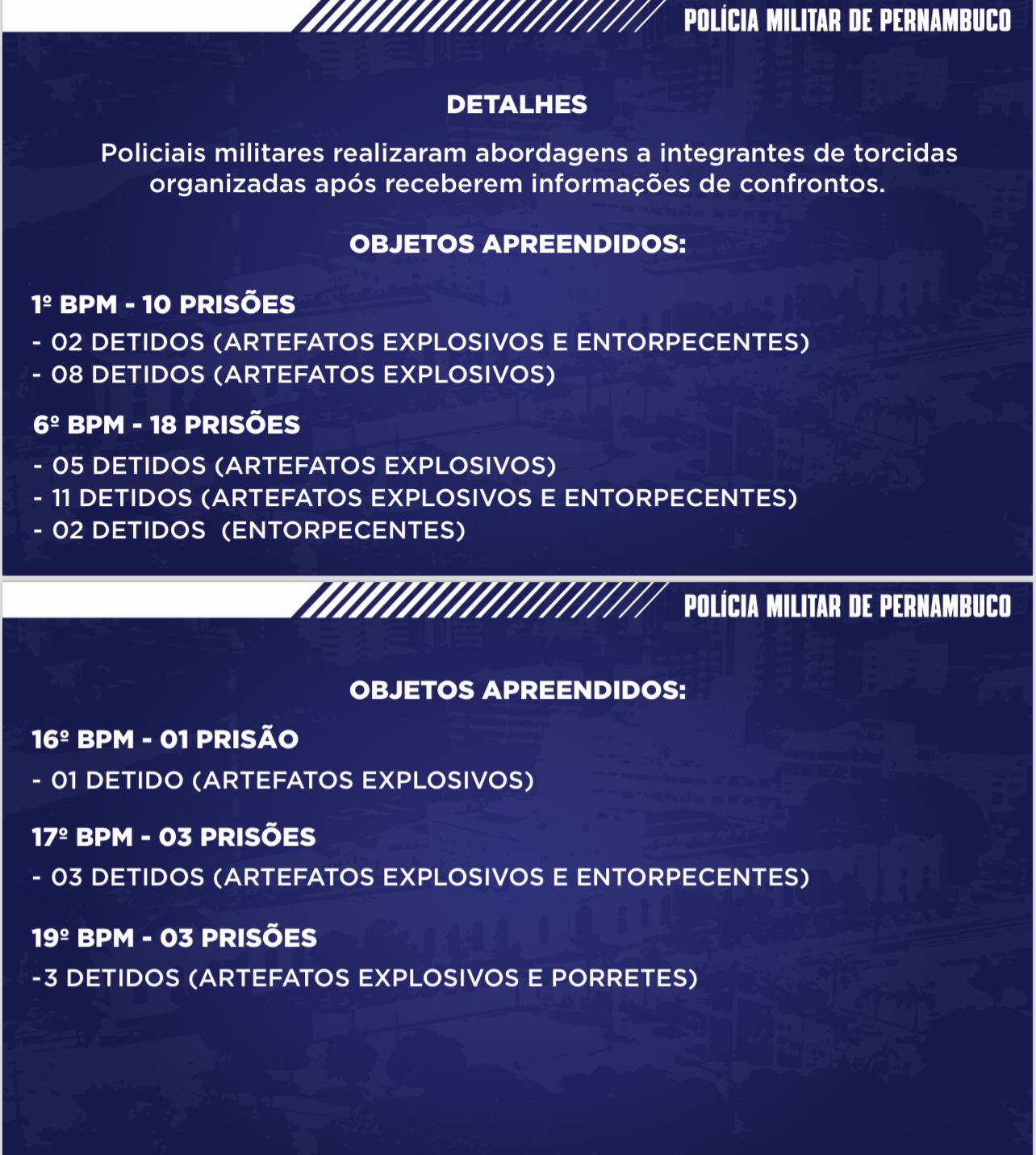 Detalhamento das prisões no dia do Clássico das Multidões. Foto: Reprodução/PMPE. O Clássico das Multidões terminou 2 a 1 para o Sport com gols de Gustavo Coutinho e Fábio Matheus para os rubro-negros. Thiaguinho marcou o gol do Santa Cruz.