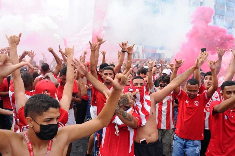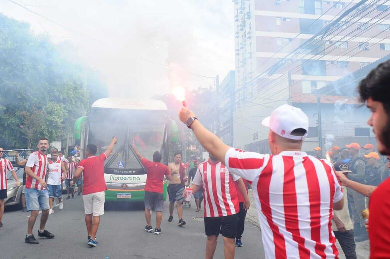 Com sinalizadores, fogos e bandeirões, a torcida do Náutico recebe o ônibus do time na chegada aos Aflitos, na Zona Norte do Recife, para primeira partida da final do Campeonato Pernambucano, contra o Sport, que começa às 16h30.