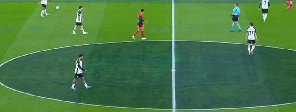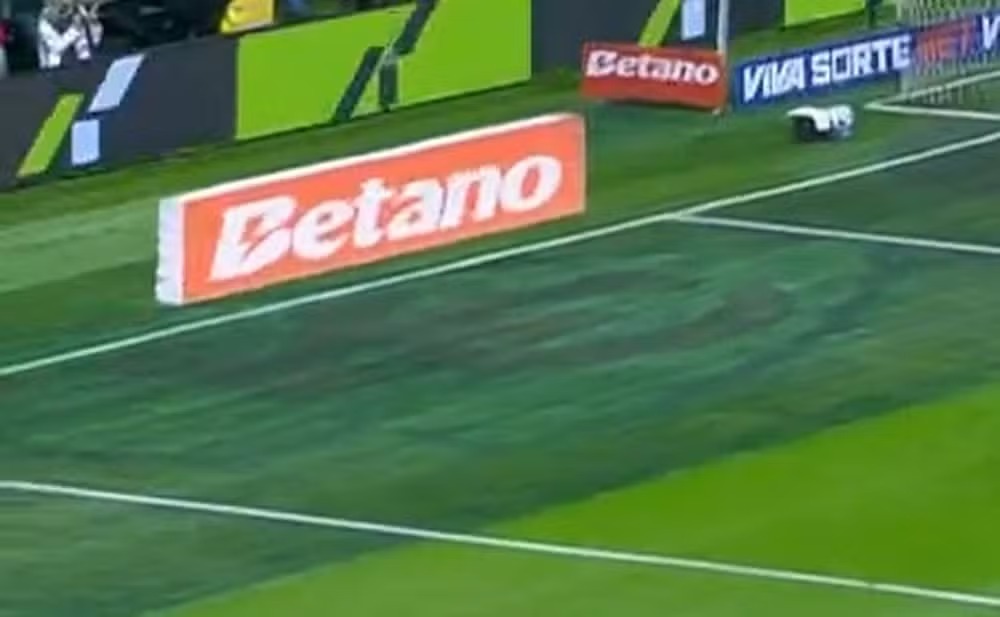 Marcas da NFL em gramado da Neo Química Arena em jogo do Corinthians — Foto: ReproduçãoOs pontos mais perceptíveis são o logo da NFL no círculo central do gramado, as linhas laterais do campo de futebol americano evidenciando uma largura bem diferente, e as marcas das endzones —zonas nas extremidades nas quais as equipes da bola oval marcam touchdowns.