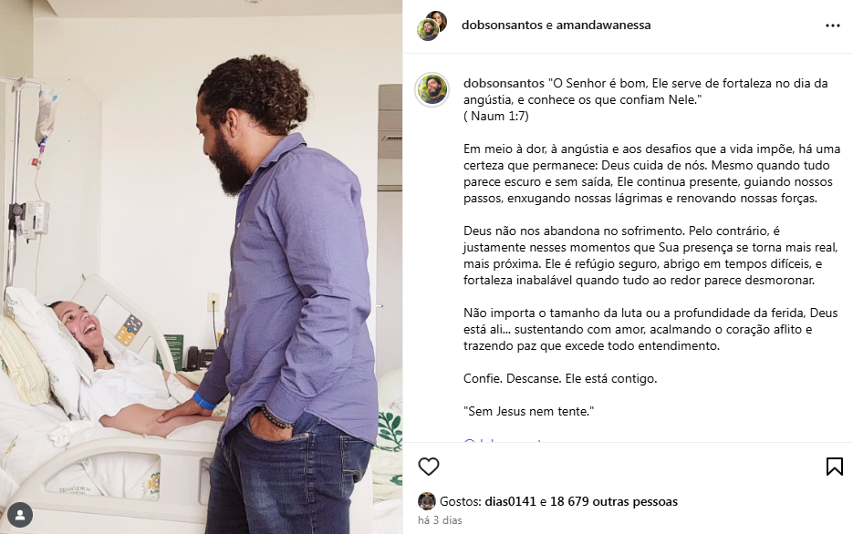 Publicação foi feita nas contas de Instagram do casal | Foto: Reprodução"Não importa o tamanho da luta ou a profundidade da ferida, Deus está ali... sustentando com amor, acalmando o coração aflito e trazendo paz que excede todo entendimento. Confie. Descanse. Ele está contigo. Sem Jesus nem tente", afirma ainda.