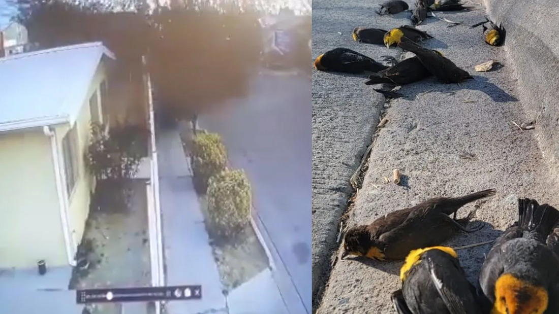 Imagens de câmeras de segurança mostram momento exato em que centenas de pássaros caem em cima de casas e no asfalto