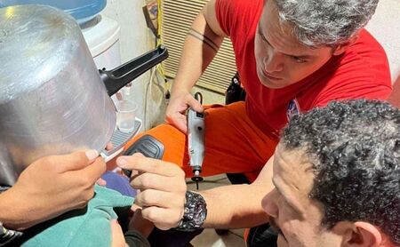 Para a retirada da panela de pressão com segurança, os bombeiros protegeram o rosto da criança com compressa cirúrgica e realizaram um corte na lateral do utensílio com auxílio de um alicate de corte, ampliando o diâmetro do vão e permitindo a remoção do objeto.