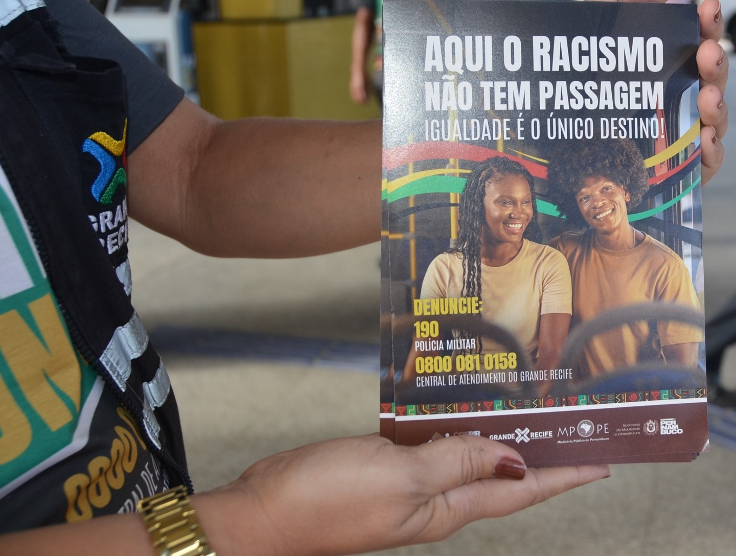 Nesta quinta-feira (20), Dia Nacional da Consciência Negra, o Grande Recife Consórcio de Transportes (CTM), em parceria com o Ministério Público de Pernambuco (MPPE), Secretaria de Justiça e Direitos Humanos (SJDH) e Conselho Estadual de Promoção da Igualdade Racial de Pernambuco (COEPIR), levaram, no dia de hoje (19), ao Terminal de Cajueiro Seco, em Jaboatão dos Guararapes, a campanha: “Aqui o racismo não tem passagem, igualdade é o único destino".