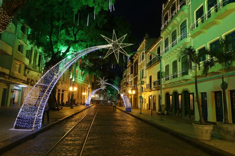 A Rua do Bom Jesus ganhou arcos e estrelas brilhantes para celebrar o ciclo natalino no bairro, e os prédios históricos,contorno luminoso em suas fachadas.
