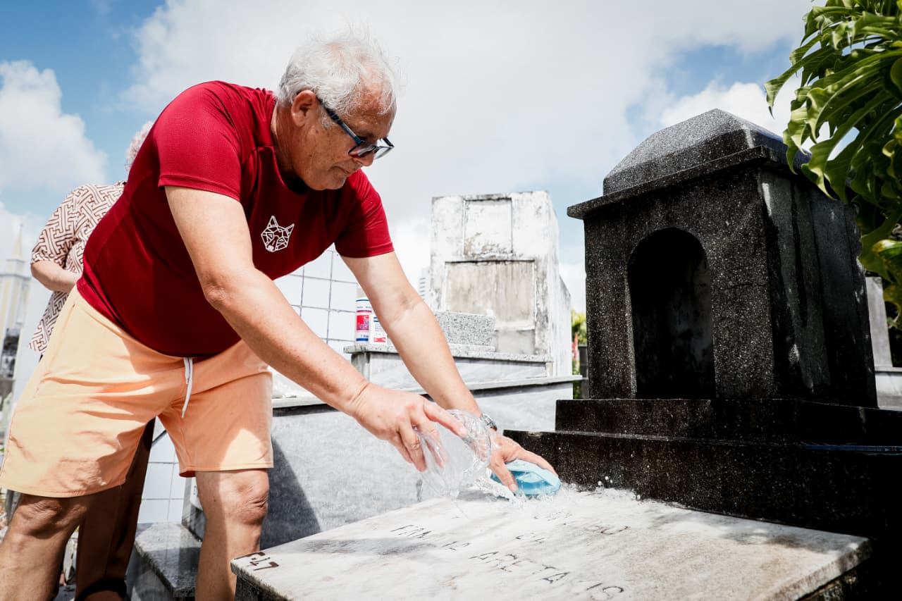 João fez manutenção no jazigo da Família Aretakis | Foto: Arthur Botelho/Folha de Pernambuco“Aqui tem pai, sobrinha, irmã e avó. A família é nutrida de carinho, amor, afetividade e união sempre. Então, não tem porque, depois que partem para outro plano, não termos esse amor e cuidado. Vou lavar, tirar o lodo, acender uma vela, fazer oração, renovar as flores e cuidar mais do jazigo”, disse ele.