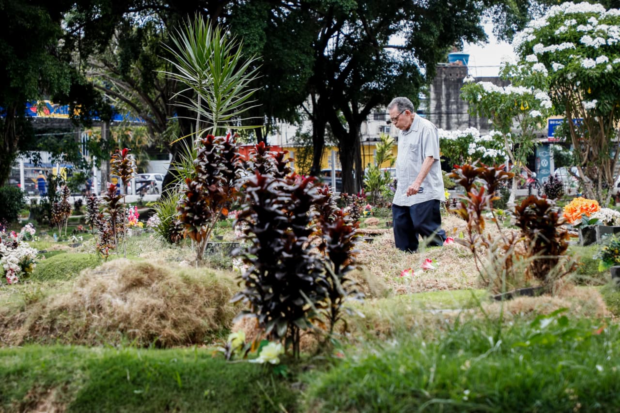Familiares também tiraram o dia para adiantar visitas a entes que partiram, a exemplo do aposentado Evangelista Paulino, de 82 anos. Ele mora em Piedade, Jaboatão dos Guararapes, e veio hoje para capinar e deixar flores amarelas no jazigo da família, onde estão sepultados seis familiares.
