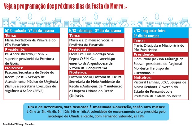Fazer sacrifícios é uma forma de demonstrar devoção. A pé, de joelhos e até mesmo andando de costas embaixo de um sol escaldante são algumas das inúmeras formas encontradas pelos fiéis para homenagear Nossa Senhora da Conceição. Nesta época do ano, o coração de Casa Amarela, bairro da Zona Norte do Recife, se veste de azul e branco. Usando a fé como combustível, milhares de pessoas sobem as ladeiras e os intermináveis degraus das escadarias do Morro para pagar promessas, acender velas e simplesmente agradecer pelas graças alcançadas. Tem ainda aqueles que buscam um milagre, seja uma cura, um bem material, ou um reencontro com alguém que não se vê há anos. Em cada pedido fragmentos de histórias de fé.