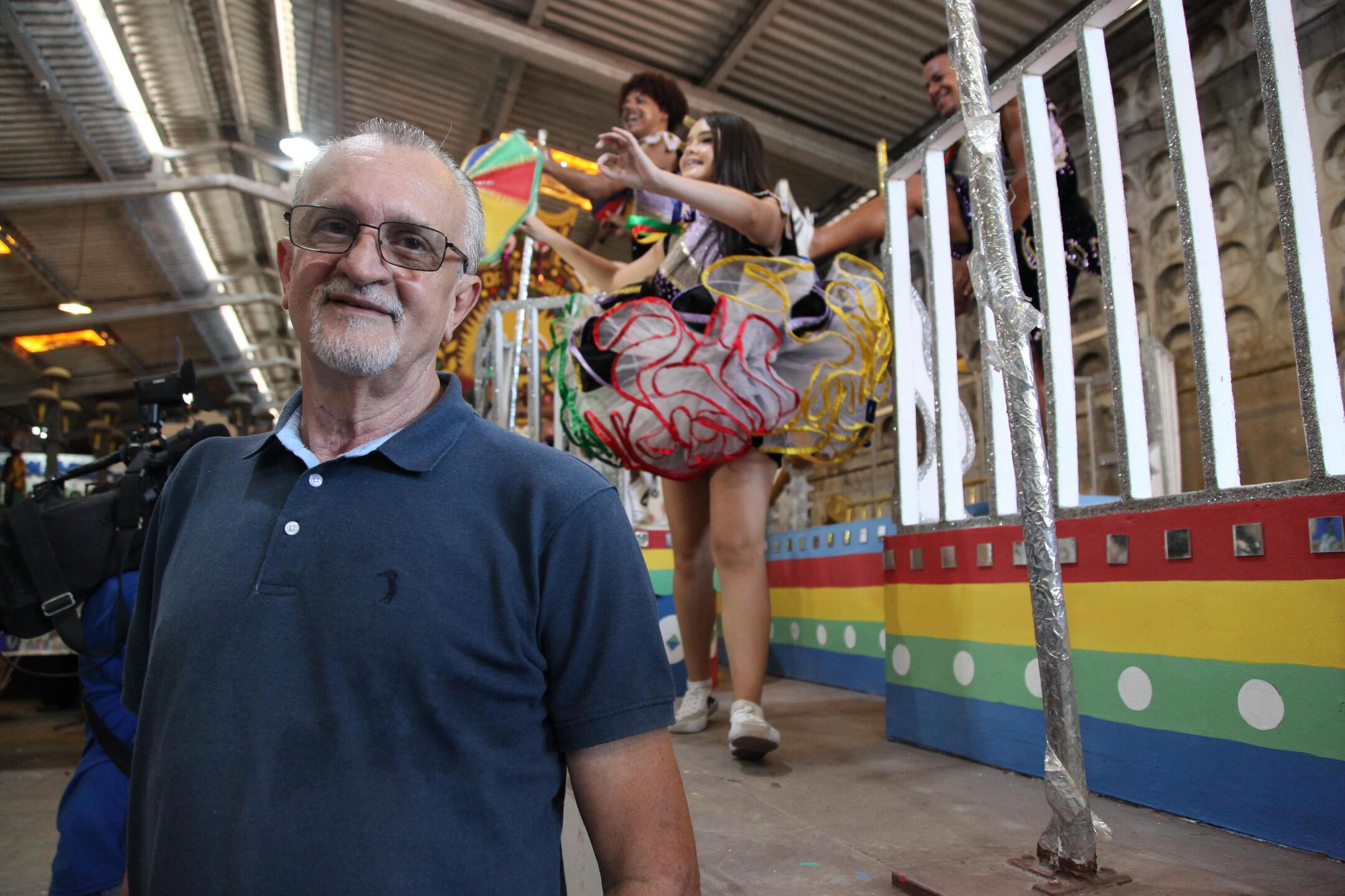 O artista plástico Sandro Nóbrega | Foto: Davi de Queiroz/Folha de Pernambuco“Algumas cidades estão sendo representadas no Galo da Madrugada. São elas: Triunfo, Pesqueira, Bezerros, Nazaré da Mata. Pegamos as mais conhecidas e tornamos isso em homenagens. A gente usa madeira, isopor, tinta, purpurina e gliter. Tudo que é brilho e colorido a gente usa. Não podemos fazer com material definitivo, porque temos que desmontar para fazer outro tema, mas essa é a base”, frisa Nóbrega.