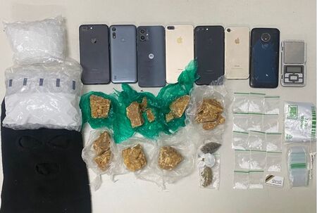 Em cima de uma mesa, foram apreendidos sete aparelhos celulares sem restrições, sete pedras grandes de crack, que juntas pesam cerca de 700g, três invólucros de maconha, 14 invólucros de cocaína, uma balança de precisão, uma balaclava, giletes e embalagens para entorpecentes.