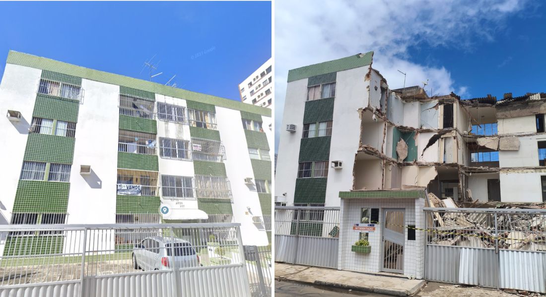Antes e depois: edifício tinha 16 apartamentos | Fotos: Google Street View/Reprodução; Redes sociais/ReproduçãoO prédio foi interditado na noite do último domingo (4), pela Defesa Civil de Jaboatão dos Guararapes, após apresentar fissuras e movimentação de estrutura. O edifício foi esvaziado, e moradores tiveram que retirar pertences às pressas.