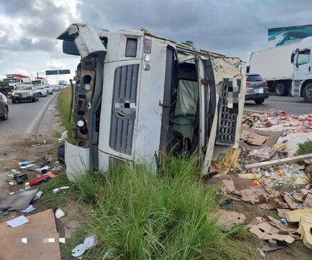 Jaboatão: caminhão tomba após colidir com carro na BR-101; motorista fica ferido e carga é saqueada