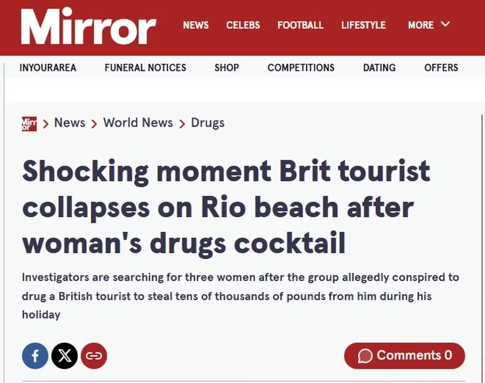"Turista britânico desmaia em praia do Rio após mulher usar coquetel de drogas", enunciou o The Mirror, outro portal do Reino Unido. Eles reportaram, ainda, que os investigadores estão procurando as suspeitas.