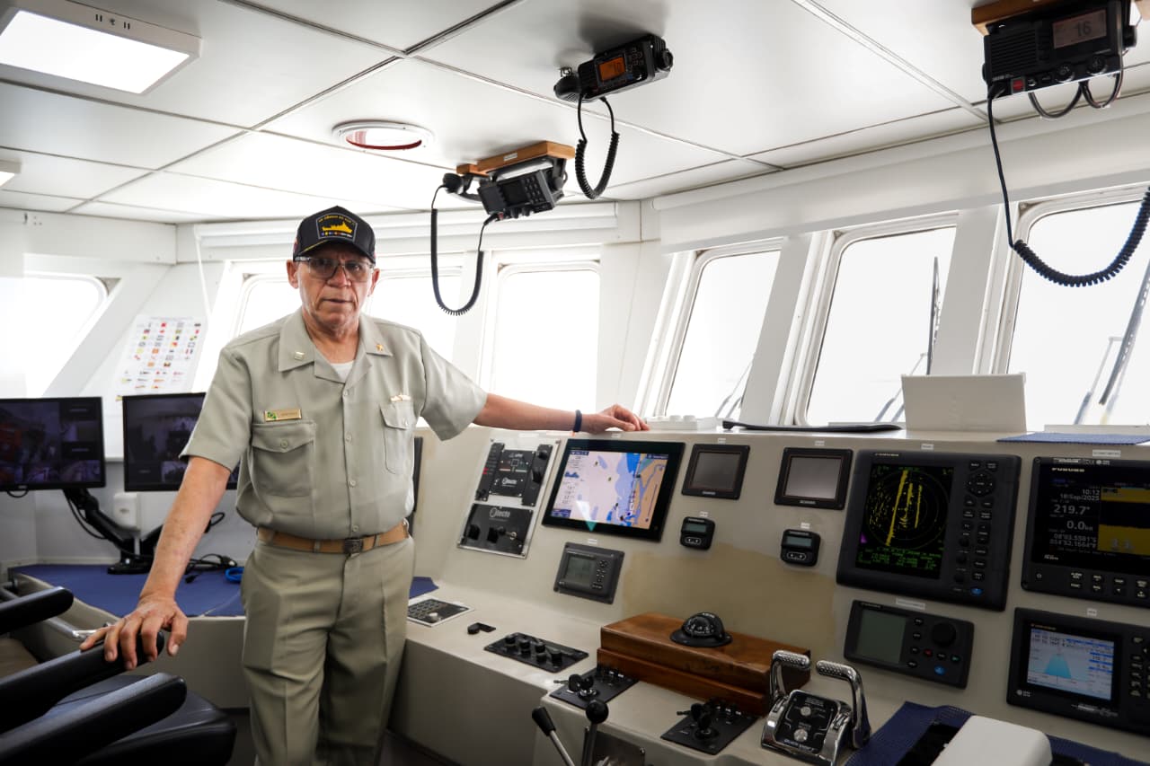 Antonio Fernandes é o comandante do navio | Foto: Arthur Botelho/Folha de Pernambuco“Nós vamos navegar 225 milhas [equivalentes a 362,102 quilômetros], até o ponto inicial da missão, numa velocidade de 7.5 kn [equivalentes a 13,89km/h]. Isso significa que vamos em marcha média. Depende dos ventos, do mar e interferências da natureza. Pode desenvolver para mais ou para menos”, explica.