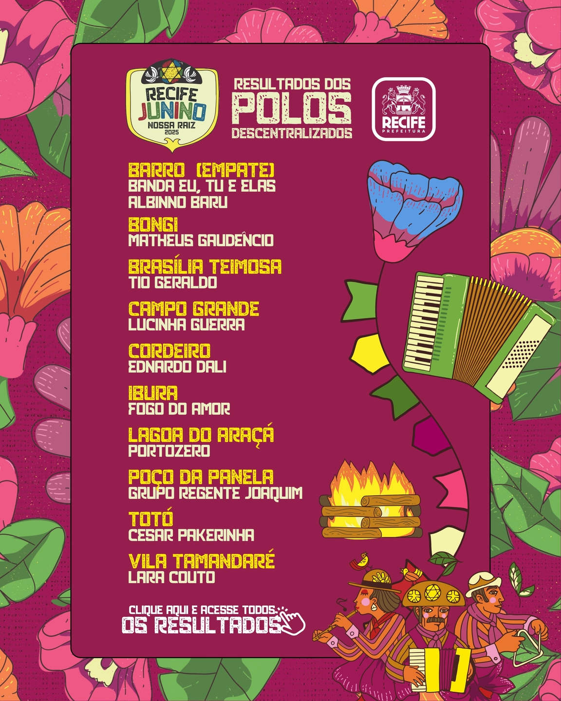 A Prefeitura do Recife divulgou, nesta terça-feira (17), o resultado da votação popular que definiu as atrações mais votadas para se apresentarem nos dez polos descentralizados do São João 2025.