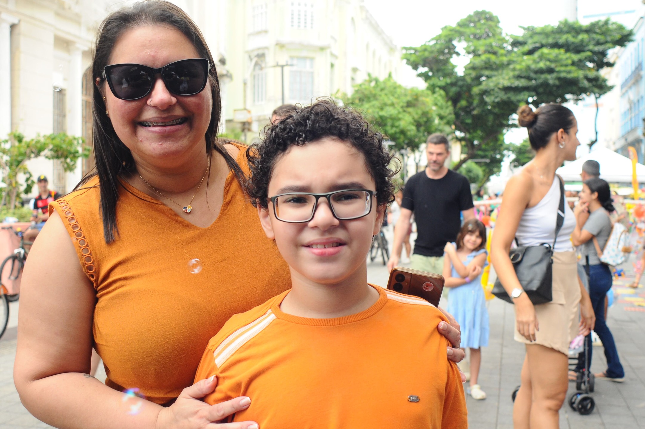 Mãe e filho aproveitaram programação | Foto: Ricardo Fernandes/Folha de Pernambuco"Eu estou gostando muito e estou dançando. A música que eu mais gosto do Tio Bruninho é 'Congela'", comentou o pequeno Pietro.