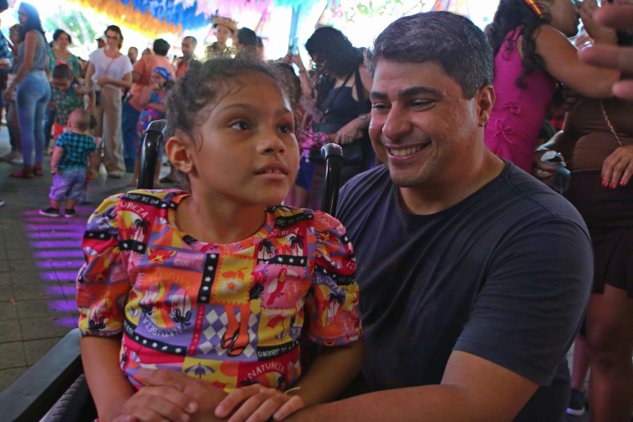 Carolina Brandão Oliveira, 8, é cadeirante. Isso não foi barreira para que ela caísse no compasso do forró. Junto ao pai, o assessor de investimentos Henrique Oliveira, de 38 anos, a menina se divertiu e ainda prometeu que vem para mais programações juninas, em todo o Recife.