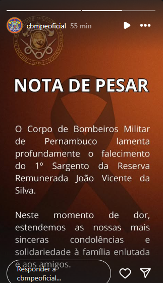 A nota do CBMPE | Foto: Reprodução/Instagram Stories“Neste momento de dor, estendemos nossas mais sinceras condolências e solidariedade à família enlutada e aos amigos”, diz o comunicado da corporação.