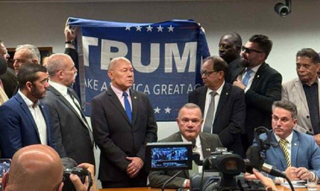 Delegado Caveira (PL-PA) e Sargento Fahur (PSD-PR) drapearam a bandeira com os dizeres "Trump Make America Great Again (lema da campanha do americano)". Ao ver a frase, o líder da oposição, Zucco (PL-RS), demoveu os parlamentares. "Estou te pedindo por favor para não fazer isso. Pode prejudicar", disse.