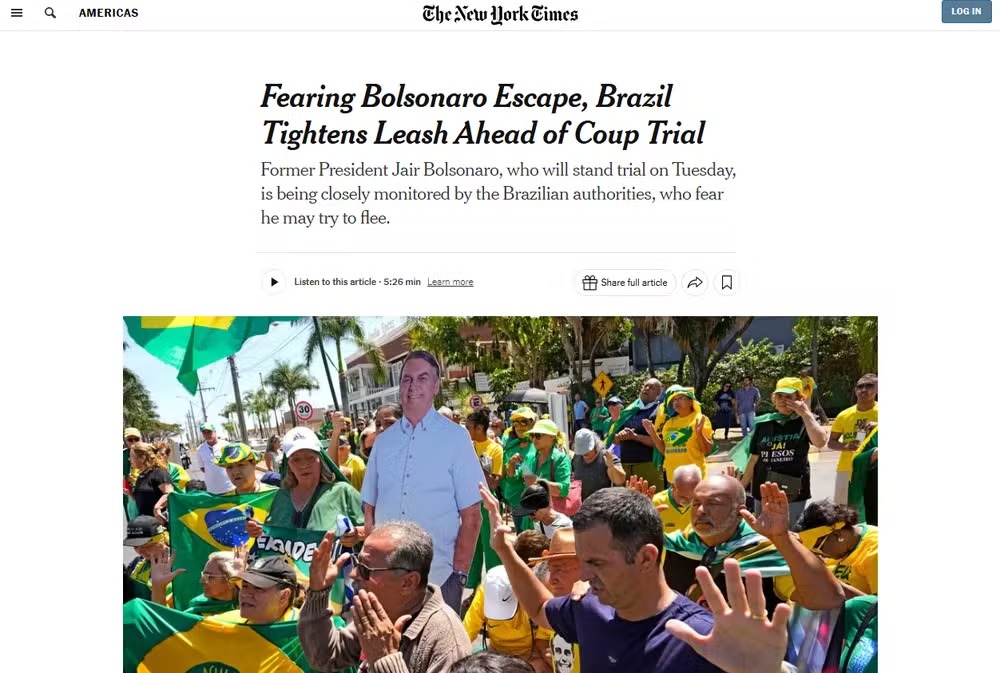 O jornal americano repercutiu o início do julgamento de Bolsonaro — Foto: ReproduçãoO diário deu destaque para o reforço da segurança na residência onde Bolsonaro está preso. As autoridades brasileiras "estão tomando medidas para apertar ainda mais o cerco ao ex-líder, em meio a crescentes preocupações de que ele possa tentar fugir", reportou. Policiais à paisana montagem guarda no local para "vigiar de perto" o ex-presidente enquanto ele aguarda o julgamento.