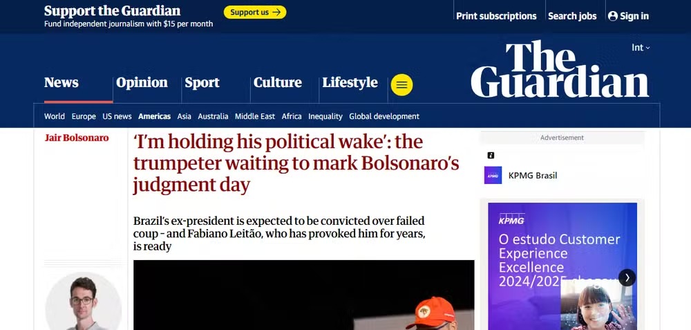 O jornal britânico The Guardian repercutiu o início do julgamento de Bolsonaro — Foto: ReproduçãoO britânico The Guardian, por sua vez, apresentou o julgamento com uma entrevista do trompetista Fabiano Leitão. O homem ficou conhecido por tocar o instrumento ao fundo de momentos que marcam reveses de bolsonaristas. Quando Bolsonaro era presidente, o músico ia atrás dele pela capital federal para tocar interpretações do hino antifascista Bella Ciao. Em março, depois de o ex-presidente ser acusado de tramar um golpe, Leitão passou a entoar a Marcha Fúnebre de Chopin.