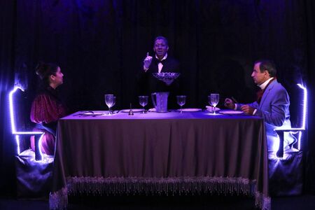 Os pratos, talheres, toalhas e guardanapos aguardam ansiosos a chegada dos convidados do Conde e da Condessa, sob a coordenação do misterioso Lacaio, interpretado por Adilson Di Carvalho.