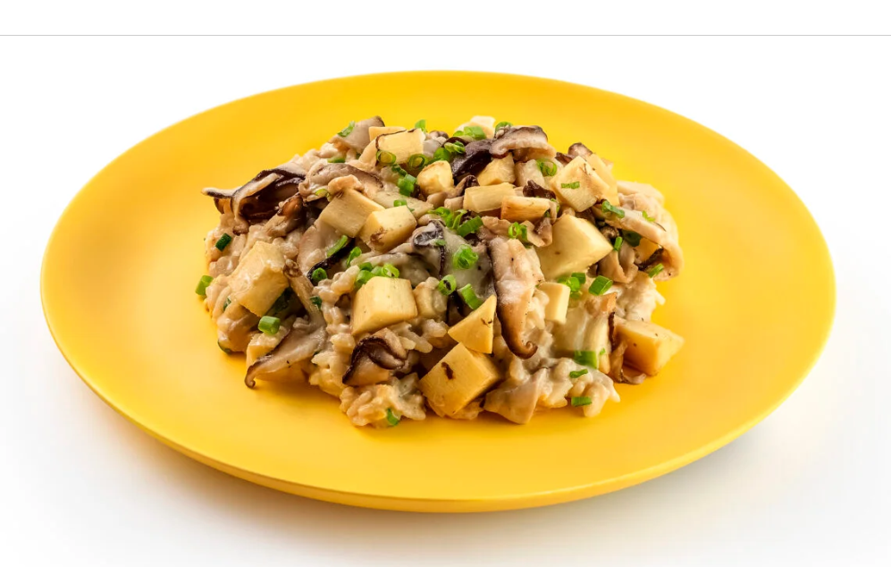 Aos poucos, vá adicionando caldo de legumes e, quando o arroz estiver al dente, acrescente os cogumelos grelhados e a manteiga. Depois de pronto, adicione as lascas de queijo por cima e sirva.